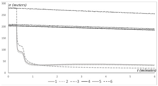 Figure 4. Root mean square deviations: 1— σ X ^ t , 2— σ Y ^ t , 3— σ Z ^ t , 4— Σ X ^ t , 5— Σ Y ^ t , 6— Σ Z ^ t .