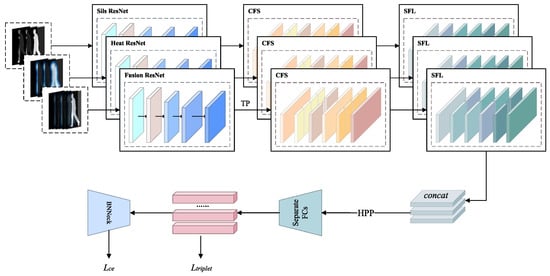 The model deploys three independent ResNet backbone networks to process silhouette features, heatmap features, and their cross-modal fusion features, where fusion features achieve multi-source information complementarity through channel dimension concatenation. Subsequently, temporal pooling (TP) is employed to aggregate global features along the sequence dimension, generating four-dimensional tensors with global representation capability: .