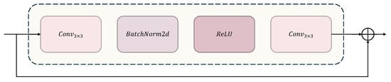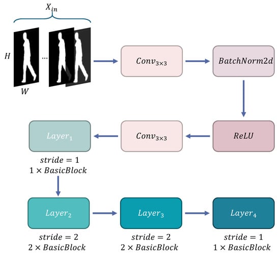 With the iterative evolution of convolutional neural network technology, breakthrough designs of classic architectures continue to drive the development of visual tasks. CNN architectures have undergone an evolution process from simple to complex, with representative ones being AlexNet [36], VGG-16 [37], and ResNet [38]. In the field of gait recognition, the shallow convolutional stacking structures [39,40] used by early researchers had limitations in feature expression capability. In GaitCSF, we borrowed the ResNet-like backbone proposed by GaitBase [41] as our model’s feature extractor, constructing a backbone network with hierarchical feature extraction capability, as shown in Figure 4. This network takes feature maps of size 64 × 44 as input and designs a feature initialization module for spatial mapping. Input features first go through a mapping layer consisting of 3 × 3 convolution kernels (stride = 1, padding = 1), extending the channel dimension to 32 dimensions, followed by batch normalization and ReLU activation function for non-linear transformation, outputting primary feature representation with dimensions (N, 32, 64, 44). The main body of the network adopts a four-stage progressive architecture, with each stage implementing progressive enhancement of feature hierarchy through several basic residual units (BasicBlock), as shown in Figure 5. Layer1 extracts local features through a single BasicBlock while maintaining 64 × 44 spatial resolution. Layer2 and Layer3 each have two BasicBlocks, utilizing stride = 2 convolution to achieve feature map downsampling, synchronously doubling channel dimensions to 64 and 128 dimensions, with feature map sizes compressed to 32 × 22 and 16 × 11, respectively. Layer4 adopts a single BasicBlock to increase channel dimension to 256 dimensions, outputting high-order feature tensor (N, 256, 16, 11). This hierarchical progressive design strategy enhances model representation capability by balancing decreasing spatial resolution and increasing channel numbers while maintaining reasonable computational overhead. The multi-scale architecture combined with residual connections captures both microscopic details and macroscopic semantic information of gait sequences, providing rich feature representation for downstream recognition tasks. Mathematically, this entire process can be represented as follows:
