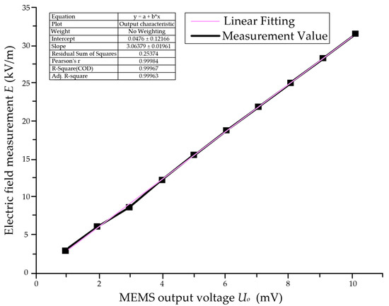 The input–output curves of the MEMS sensor were linearly fitted to obtain the linear fit equation intercept, slope, and linear fit. That is, E = 3.0638 Uo + 0.0476, where E is the input electric field, Uo is the output voltage of the electric field sensor, and the linear fit R2 is 0.9998; the closer to 1, the better the linear fit. According to the input and output characteristics of the sensor under the action of power frequency, it can be concluded that the sensor has a good linear input and output relationship in the range of 5 kV/m~30 kV/m. The sensor can be calibrated according to this linear relationship, and it can be used to realize the electric field measurement in the near-electricity early warning device.