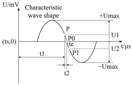 First, a point-by-point comparison of the A/D sampling points is performed and the maximum value of the sampling point is identified to determine the period of the largest amplitude of the characteristic wave. A characteristic wave waveform diagram is shown in Figure 4. Second, we determine the crossing time corresponding to each sampling point before the zero point, P0 (P and P1). Clearly, the P sampling value is greater than 0, and the P1 sampling value is less than 0. Finally, using the time corresponding to P and P1 as a benchmark, the moment corresponding to P0 can be accurately calculated by the subdivision insertion algorithm, and then, the distance between the sensor and the measured target is calculated according to Equation (5).
