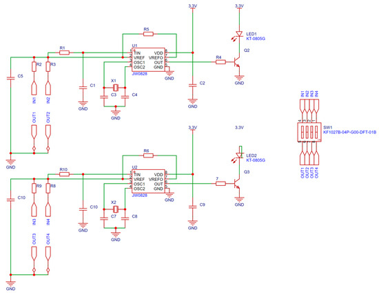 To mitigate the impact of temperature variations on circuit performance, a self-check circuit is integrated to ensure stability under diverse conditions. The dial code switch SW2 allows for the adjustment of resistances R, R3, Rg, and Ro, enabling a change in the circuit’s operational state and facilitating the transition between ‘test’ and ‘silent’ modes. The signal is output from pins 6 of transistors Q1 and Q3, and after amplification by Q2 and Q4, it is fed into LED1 and LED2 for indication.