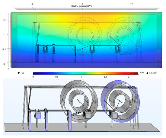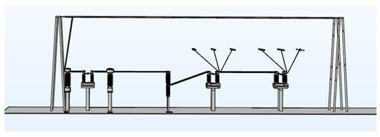 In order to obtain the electric field intensity value at the two-stage distance threshold, as the electric field alarm threshold, this paper studies the judgment standard of the proposed near-electricity early warning device through COMSOL simulation and selects the typical operation scene of a 220 kV substation for electric field simulation calculation, as shown in Figure 6, analyzing the spatial electric field distribution by simulation (see Figure 7).