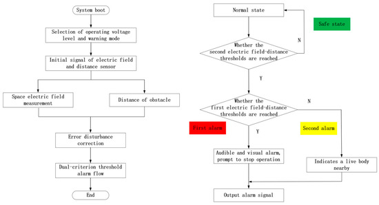 After the warning system is activated, the working voltage level and warning mode (personnel operation warning and mechanical operation warning) are determined first, and then, the measurement of electric field and distance begins. By measuring the electric field strength of the operator or the machinery and the distance between the protected object and the surrounding live body, a comparison with the electric field alarm threshold and distance alarm threshold for all levels is performed to determine whether the alarm and the alarm level are needed.