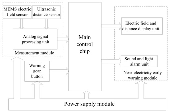 The hardware system of the near-electricity warning device comprises multiple functional modules, including an electric field measurement module, a distance measurement module, a master control chip, an early warning gear button, an alarm display module, and a power supply module, as shown in Figure 10.