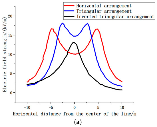 Figure 14 illustrates the distribution of electric field intensity at the terminal output at various distances from the three-phase 220 kV line. A notable negative correlation exists between the near-end electric field and the distances of the two-phase lines, A and C. Additionally, the peak value of the electric field strength of phase B is significantly lower than that of the other two phases. This reduction is attributed to the counteracting effect resulting from the superposition of the electric fields of phases A and C. Overall, the observed trends align with the simulation results.