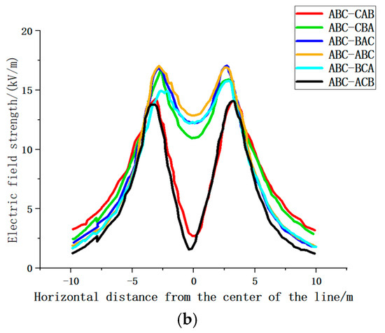 Field strength under single-loop transmission lines with different arrangement modes tested by warning device. (a) Field strength under single-loop transmission lines with different arrangement modes. (b) Field strength under dual-loop transmission lines with different phase sequence modes.