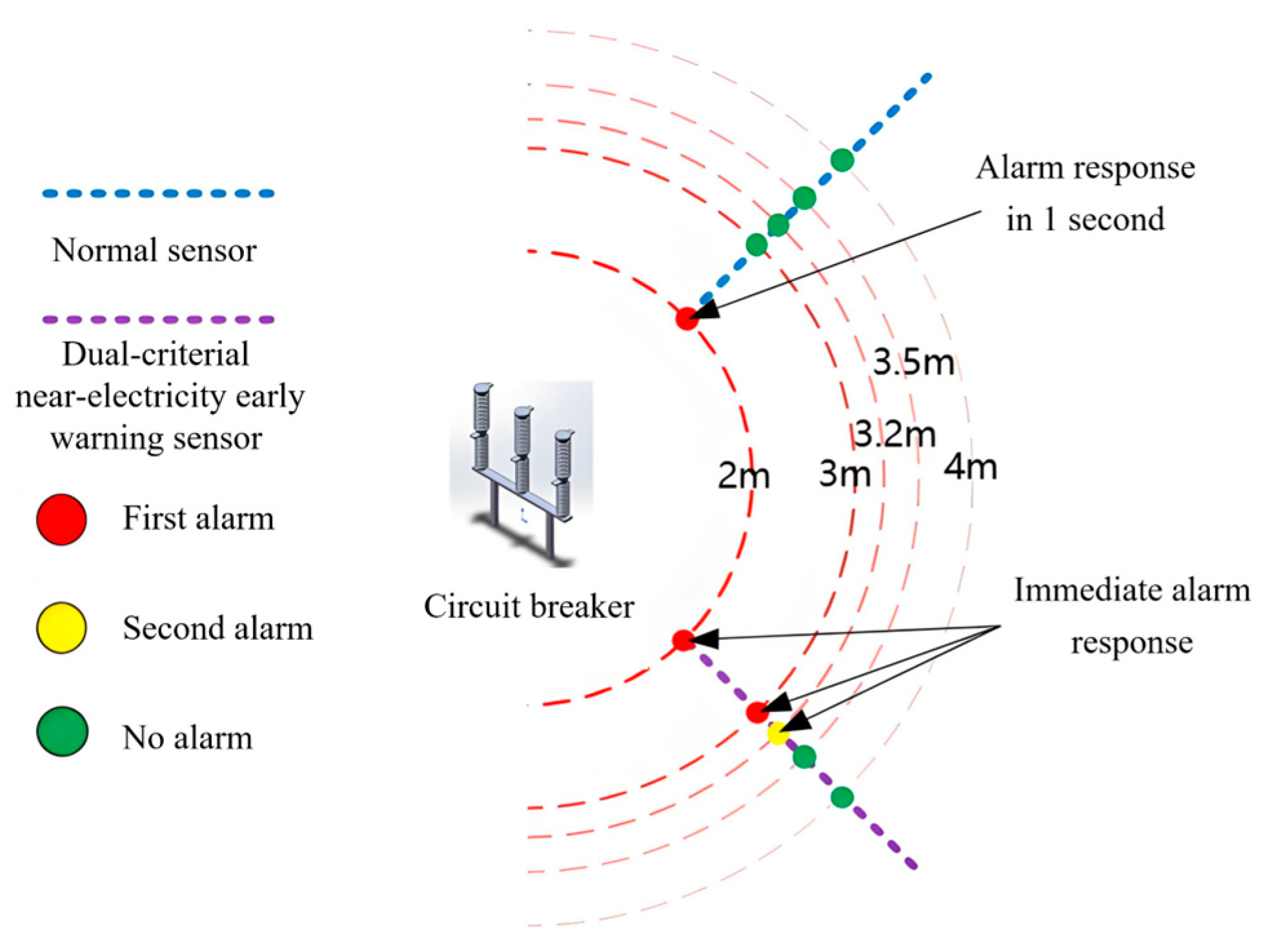 The double-criterion near-electricity warning device can measure both the electric field strength and the distance between the operator and live equipment within 0.1 s. Its alarm features, based on the criteria of electric field and distance, enhance accuracy. Unlike traditional sensors, which remain silent, the double-criterion sensor effectively distinguishes threat levels and triggers an alarm at distances of 3.2 m and 3 m. By setting different alarm thresholds, the double-criterion system effectively minimizes the occurrence of false alarms and missed alarms.