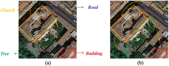 Local features and long-range contextual information selected from the “Church” class. By observation of Figure 1. (a), we can see that this scene contains many different types of objects, such as “Tree”, “Building”, “Road” and “Church”. If the model only focuses on and learns these local structural features, the “Church” scene may be misclassified as other scenes with similar ground objects (e.g., “Building”). Therefore, both local context information and global context information are crucial for scene classification. For example, in image (b), when the model can fully understand the distant dependency relationship between “Tree”, “Church”, “Road” and “Building,” the scene can be correctly classified as “Church. Therefore, leveraging the contextual semantic features across various scenes facilitates a more precise representation of scene images.
