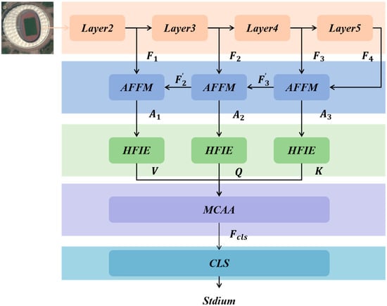 In the proposed architecture for RS scene analysis, the process begins with multi-layer convolutional features ([F1, F2, F3, F4]) extracted from different layers (Layer2–Layer5) of a convolutional neural network. AFFM processes these features successively, reducing the semantic gap and outputting refined features (A1, A2, A3). These refined features are then fed into HFIE, which, via HLFTM and other components, establishes long-range feature dependencies and extracts high-frequency local information. The outputs from HFIE are used to compute the key (K), query (Q), and value (V) matrices, which are input into MCAA. MCAA, by aligning the context across layers using the deep global semantic features as a guiding key, generates a discriminative feature representation (Fcls) that is ultimately used for classification by the classification head (CLS). This sequential and interactive processing of features across different modules enables a more accurate and comprehensive understanding of RS scenes for classification tasks.