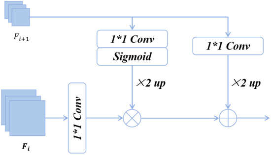 where i = 1, 2, 3, represents the shallow-layer features, and represents the deeper-layer features, presents a 1 × 1 convolution and batch normalization, δ denotes the Sigmoid activation function, ↑ represents the × 2 upsampling.