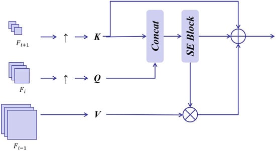 Thus, in this study, we innovatively propose a Multi-layer Context Alignment Attention mechanism. The core of this method lies in skillfully using the global semantic features as the key elements to guide the calculation of the attention matrix so as to ensure accurate feature selection. As shown in Figure 7, we first perform upsampling operations on the features of three different levels to make them reach the same size so that feature selection and interaction can be carried out at a unified scale subsequently.