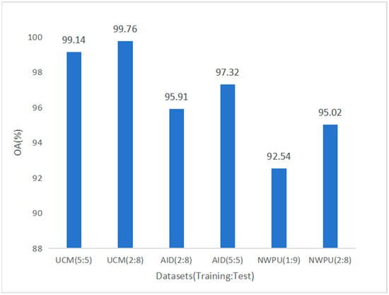 On the AID dataset, both the OA and Kappa coefficients are relatively high, indicating that the classification results of the algorithm have good consistency with the real situation. As the ratio of the training set to the test set changes, the performance of the model also improves. The indicators under the (5:5) division are higher than those under the (2:8) division, suggesting that a more balanced data division is conducive to the model’s learning, thereby improving classification accuracy and consistency.