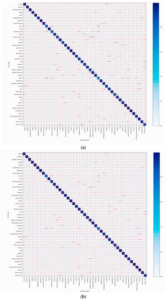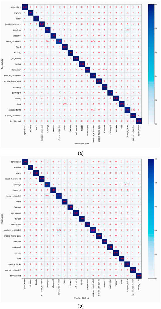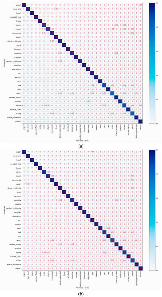 We repeat the experiments five times by randomly selecting training/testing samples to obtain reliable experimental results. Then, the average results and standard deviations are reported. The training–testing ratios of UCM, AID, and NWPU are set to 50%:50% and 80%:20%, 20%:80% and 50%:50%, and 10%:90% and 20%:80%, respectively. Two widely used evaluation metrics are selected to assess the classification performance, including overall accuracy (OA) and confusion matrix (CM). OA is defined as the number of correctly classified images divided by the total number of testing images, reflecting the overall performance of a classification model. CM is used to analyze the detailed classification errors and confusion degrees between different scene classes. In CM, each row/column denotes the true/predicted class.