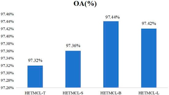 All experiments were performed using Pytorch on a [52] workstation equipped with a GeForce 428 RTX 3090 graphics card and 24GB of RAM. HETMCL’s ResNet18 was initialized with pre-trained parameters (using the ImageNet dataset), while the rest of the model was initialized randomly [53]. In the data pre-processing phase, all input scenarios are uniformly adjusted to 224 × 224 resolution. At the same time, in order to enhance the diversity of data, the data augmentation strategies of random rotation (rotation angle range from −90° to 90°), horizontal flip and vertical flip were adopted to effectively expand the sample size of the dataset and improve the generalization ability of the model. During the training process, the Adam optimizer was used to train the model for 100 cycles. The initial learning rate is set to 0.0001, and a cosine decay learning rate scheduler with a linear warm-up is used to make the model more stable in the early stages of training. At the beginning of the training stage, the learning rate gradually increases to the initial learning rate through a linear warm-up strategy and then decays according to the cosine function law. The selection of 32 as the batch size ensures the reasonable use of video memory and enables the model to fully learn the data features during the training process. The batch size of 32 can balance the training speed and convergence effect under the limitation of video memory capacity and avoid the problem of insufficient video memory due to too large a batch or unstable model training due to too small a batch. The training conditions of different datasets are consistent to ensure that the experimental results are comparable and reliable, and the above parameter settings have been adjusted and optimized after multiple rounds of experiments to maximize the performance of the model so as to improve the reproducibility and credibility of the experiment.