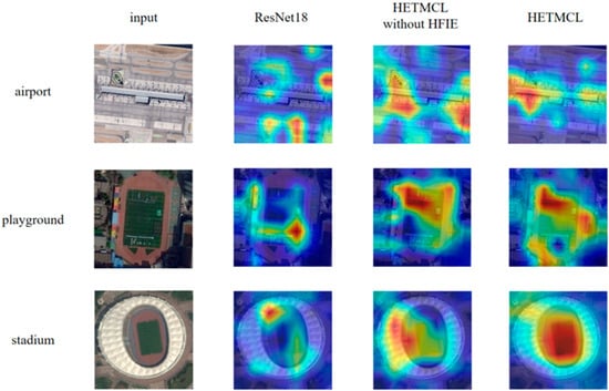 Widely Distributed Target Recognition: For playground images, ResNet18’s activation scatters across sports fields and surroundings, indicating interference and incomplete target coverage. The HFIE-free model focuses on lawns and runways but retains edge activations. HETMCL comprehensively covers core sports areas, suppresses irrelevant edges, and extracts features more accurately for superior classification.