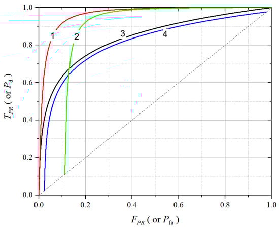 - ROC curve 1: represents the best performance among those shown, which can be achieved as a result of the cooperation gain in cooperative spectrum sensing (CSS) [10,32]. It achieves high detection probability () even at low false alarm rates (), indicating both high sensitivity and specificity.