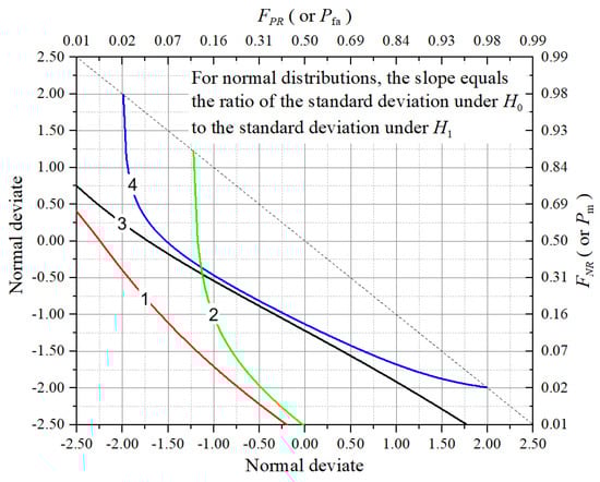 Figure 2 illustrates typical shapes of four DET curves, each corresponding to a different detector or sensing configuration. These DET curves correspond to the ROC curves shown in Figure 1, and can be interpreted as follows: