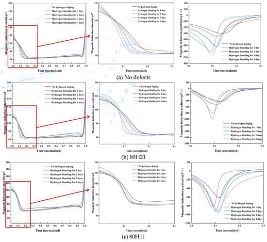 To facilitate the comparison, the tensile time of the specimens is normalized. Weak magnetic signals of defect-free and defective specimens (80H21, 80H11, and 80H12) are presented in Figure 12. The variation in magnetic signals is the most obvious during the elastic phase of the tensile process. Therefore, magnetic signals are collected to observe the weak magnetic characteristics. Figure 13 presents the initial magnetic signal, the initial magnetic signal derivative, the peak of magnetic signal, and the peak magnetic signal derivative for all specimens. In Figure 13a, high hydrogen concentrations can cause larger initial magnetic signals, with values increasing as the defect depth increases, reaching a maximum of 144.3 μT. With the increase in defect diameter, the values of initial magnetic signals decrease, with a maximum of 131.1 μT. As shown in Figure 13c, the peak of magnetic signal gradually decreases with the increase in the hydrogen concentration. Additionally, it can be indicated from Figure 13d that increased hydrogen concentrations correlate with higher absolute values of peak magnetic signal derivatives. With an increasing defect depth and decreasing defect diameter, the absolute value of peak magnetic signal derivative gradually increases, achieving a maximum peak magnetic signal derivative of −1542.0 μT/s. Weak magnetic signals are related to the hydrogen concentration and corrosion defects, which can reflect the mechanical properties.