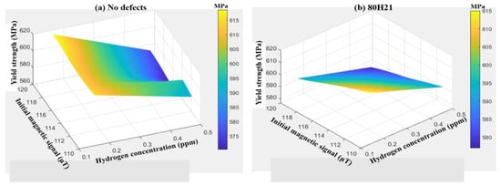 - An increased hydrogen concentration results in higher initial magnetic signals. The initial magnetic signal increases with the increase in defect depth and decreases with the increase in defect diameter; the peak value of the magnetic signal gradually decreases with the increase in hydrogen concentration; and an increased hydrogen concentration is related to the increase in the absolute value of the peak magnetic signal derivative. By calculating the degree of correlation, the critical factors of the ultimate bearing capacity are the peak magnetic signal derivative and hydrogen concentration; the critical factors of the ultimate tensile strength are the peak magnetic signal and hydrogen concentration; and the critical factors of the yield strength are the initial magnetic signal and hydrogen concentration.