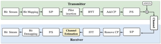 The channel estimation system model consists of two parts: the transmitting end and the receiving end. At the transmitting end, the input bit stream is modulated and mapped onto the OFDM subcarriers, and pilot symbols are inserted at specific subcarrier positions for subsequent channel estimation. Then, the frequency-domain signal is converted into a time-domain signal through the inverse fast Fourier transform (IFFT), and a cyclic prefix is inserted. CP is used to resist Inter-symbol interference (ISI), and finally the signal is transmitted through the additive white Gaussian noise (AWGN) channel. At the receiving end, the signal successively removes the cyclic prefix, undergoes fast Fourier transform (FFT) to convert back to the frequency domain, extracts the pilot symbol, and uses the pilot signal for channel estimation, thereby obtaining the channel state information (CSI). Subsequently, the channel influence is eliminated through frequency-domain equalization, the amplitude and phase of the signal are restored, and then the original bit stream is restored through subcarrier demapping and demodulation. The specific process is shown in Figure 1, which shows the training data sources of SDRNet (such as OFDM pilot signals) and the processing flow.