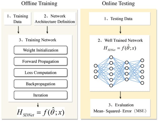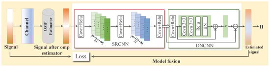 In the field of signal processing, SRCNN and DNCNN are integrated into the super-resolution denoising network (SDNet) model, aiming to give full play to the super-resolution advantage of SRCNN and the efficient denoising ability of DNCNN, thereby simultaneously improving the accuracy and robustness of channel estimation. Based on this, the SDNet channel estimation framework based on the OMP algorithm was further developed. This framework consists of two stages: discrete training and online estimation. The entire network structure proposed is shown in Figure 4. In the offline training stage, after obtaining the channel estimation result of the OMP algorithm, it is input as the training set into the neural network, and the standard deep neural network training process is used to obtain a well-trained model. Subsequently, in the online estimation stage, the test data is input into the well-trained SDNet to obtain the estimated channel coefficients. Although Figure 5 shows a general process, the proposed algorithm embeds a unique design in each step. In the training network of offline training, we used the specially designed OMP algorithm combined with the deep learning channel estimation algorithm to complete the channel estimation task. During the online testing stage, well-trained networks apply SRCNN and DNCNN to improve the accuracy of channel estimation in our specific scenarios. The overall process is shown in Figure 5 as follows: