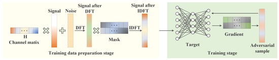 In this section, firstly, the signal generation, processing and the traditional OMP algorithm are described, and then the network super-resolution denoising network (SRCNN DNCNN network, SDNet) after model fusion is introduced in detail, and the optimized super-resolution denoising residual network (SDRNet) on this basis is introduced. Finally, the generation of the channel-aware adversarial sample algorithm based on frequency-domain transformation was elaborated in detail, verifying the importance and accuracy of SDRNet channel estimation. As shown in Figure 2, it represents the training process of SDRNet, and Figure 3 represents the generation process of adversarial samples.