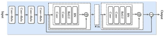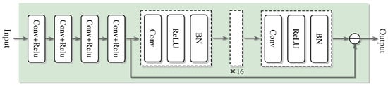 First comes the input layer , which is responsible for receiving and carrying the input data. The second, third, and fourth layers immediately following are convolutional layers, each equipped with a different number of filters with varying sizes of convolution kernels. After each convolutional layer, a rectification linear unit activation function is connected to perform initial feature extraction and transformation of the data. At this point, the obtained intermediate output is saved. Subsequently, the data flows through multiple convolutional layers of size (3 × 3) with the same fill settings. Each Conv layer here is successively connected to a batch normalization layer and a rectification linear unit activation function. Through this series of processing, the noisy image is obtained. Ultimately, subtract the resulting noisy image from the previously saved output, and the difference obtained is the final output result of the entire network. It is worth emphasizing that each connection in the above architecture corresponds to a specific weight. As shown in Figure 6, the output of the entire network can be expressed by the following formula: