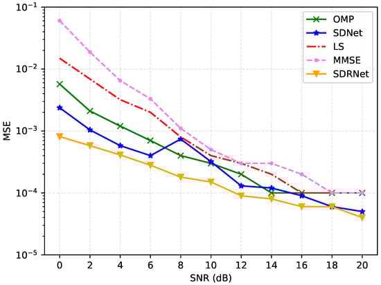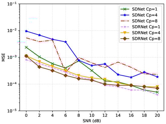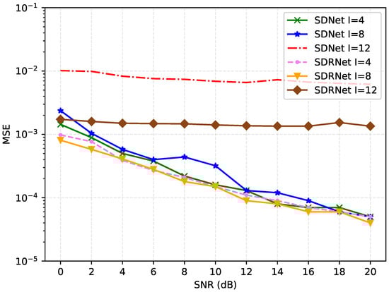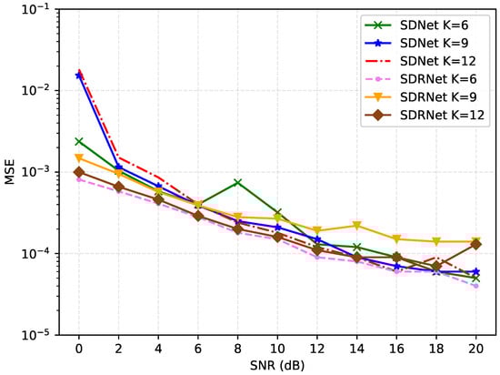 Figure 11 compares the MSE performance changes in SDNet and SDRNet under different channel sparsity (K = 3, 6, 9). When the sparsity of SDNet increases from K = 3 to K = 6, the MSE slightly decreases, indicating that a moderate increase in sparsity is conducive to improving the accuracy of channel estimation. However, when the sparsity further increases to K = 9 and K = 12, the MSE rises significantly, indicating that an excessively high sparsity will make the channel overly complex and reduce the estimation performance. In contrast, the MSE of SDRNet slightly decreased from K = 3 to K = 6, and then remained stable, demonstrating strong robustness to changes in sparsity. This indicates that SDRNet can better adapt to channel environments with different sparsity, while the performance of SDNet depends more on the reasonable selection of sparsity.