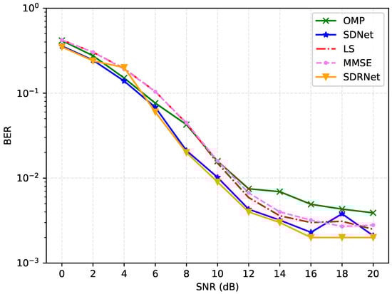 Channel estimation is essential for ensuring communication quality, with traditional OFDM-based methods exhibiting distinct advantages and limitations. The least squares (LSs) method [5,6], widely used for its computational simplicity, suffers from severe performance degradation in low-SNR scenarios due to its disregard for noise. Discrete Fourier transform (DFT)-based techniques [7] effectively suppress noise through frequency-domain filtering while maintaining low complexity; however, their performance rapidly deteriorates when frequency offsets exceed 5% of the subcarrier spacing. The linear minimum mean square error (LMMSE) method [8,9], though capable of achieving near-optimal estimation under moderate-to-high SNRs, depends on prior knowledge of channel covariance and exhibits cubic computational complexity, limiting its scalability in large-scale MIMO systems.