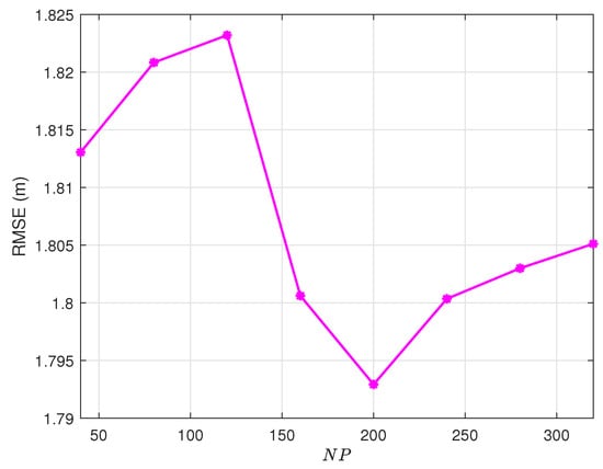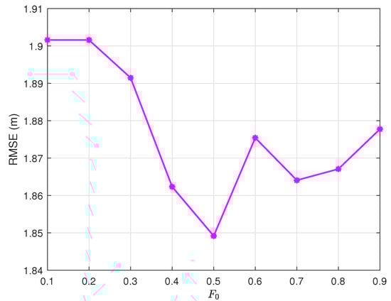 It is well known that the DE algorithm involves multiple key parameters that significantly influence its performance and convergence behavior. Among these variables, the number of iterations of the population G plays a crucial role in determining the maximum number of evolutionary generations that the algorithm undergoes. Furthermore, the population size , which represents the number of individuals in each generation, directly affects the diversity and exploration capacity of the algorithm. Another essential parameter is the probability of crossover , which controls the rate at which genetic information is exchanged between candidate solutions during the recombination phase. Furthermore, in our proposed enhanced DE algorithm, we introduce an adaptive scaling factor as its initial value, which dynamically adjusts to improve the efficiency of convergence. Alongside this, we incorporate an expansion factor , which is utilized to modify the constraint conditions, thereby enhancing the algorithm’s flexibility and robustness in handling optimization problems under varying conditions. In this section, we study the values of each variable in turn and find the values that improve the performance of DE. Through systematic experimentation, we investigate the effects of four critical parameters. All experiments maintain constant environmental conditions (, , ) within a search domain. The performance criterion is the root mean square error (RMSE), which is defined as