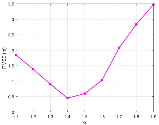 To generate RSS measurements, we set the path loss dBm, the path-loss exponent , and the reference distance m. In all the experiments in this paper, the number of Monte Carlo runs is . The anchor nodes and target node are randomly distributed in a square area of . And the target node can communicate with all the anchor nodes. The performance criterion is the RMSE.