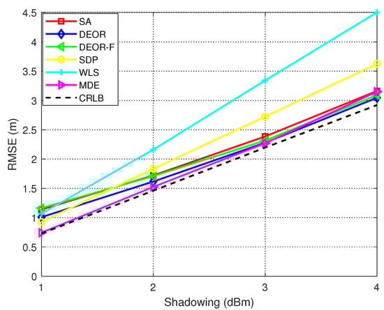 In Figure 7, we show that when the noise is constant, the RMSE changes with an increase in the number of anchor nodes ANs. The MDE algorithm yields lower RMSE values with increasing numbers of anchor nodes. It should be noted that these suggested parameter values (namely, of , , , and G) are not absolute or universally valid, as their appropriate settings fundamentally depend on the characteristics of each particular problem.
