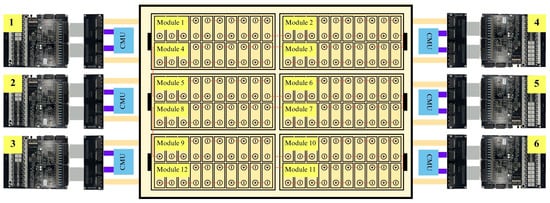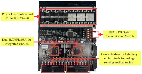 BMS is essential for monitoring and maintaining the battery’s health, ensuring safety, and optimizing energy usage. The BMS features six modules, each equipped with dual BQ76PL455A-Q1 ICs (Texas Instruments Inc., Dallas, TX, USA.) for high-accuracy voltage monitoring. Detailed specifications are provided in Table 2.