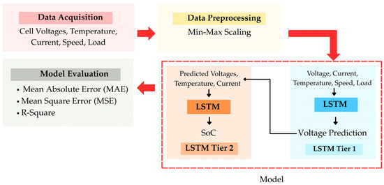 Systematic workflow illustrating the process of data acquisition, preprocessing, and input preparation for a Long Short-Term Memory (LSTM)-based framework. The framework supports the forecasting of individual cell voltages and the estimation of State of Charge (SoC) within battery management systems.