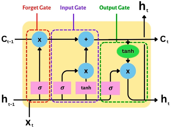 The LSTM models, illustrated in Figure 3, integrate three key gating mechanisms—the forget gate, input gate, and output gate—allowing selective retention and disposal of information based on relevance. The capability described earlier makes LSTMs remarkably useful for real-time analysis of battery states influenced by sensor data, where changes in voltage, temperature, and current are fundamental signs of the battery’s overall condition.