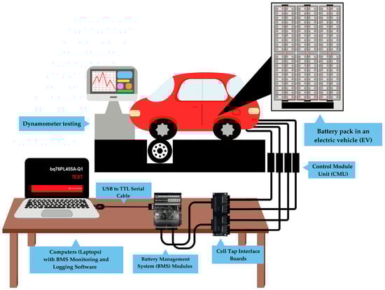A total of six BMS boards, each equipped with dual BQ76PL455A-Q1 integrated circuits, were used for real-time battery monitoring and data acquisition. Although each BQ76PL455A-Q1 IC had the capacity to regulate up to 16 cells (or 32 cells per BMS board), the configuration was optimized to monitor 20 cells per board (10 cells per IC) to enhance measurement accuracy. The system operated at a sampling frequency of 0.5 seconds per cycle, ensuring high-resolution data logging via the Texas Instruments software, which was specifically tailored for the BQ76PL455A-Q1 integrated circuits.