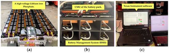 Battery system components used in the study: (a) a high-voltage battery assembly; (b) the BMS, which encompasses the Cell Monitoring Units (CMUs); (c) software interface used for battery diagnostics, control, and real-time monitoring and management.