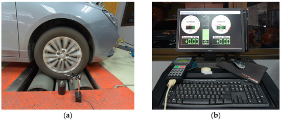 Electric vehicle testing setup on the 2WD 6000 dynamometer platform: (a) electric vehicle mounted on the 2WD 6000 dynamometer system with integrated measurement instruments, enabling controlled testing at various speeds and load conditions; (b) monitoring station with Quantum software interface.