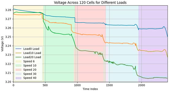 The voltage behavior illustrated in Figure 8 provides critical insights into the battery pack’s performance under varying operational conditions. Initially, a distinct relationship is evident between the escalation of load and the resultant voltage decline across all cells, with the condition of 20% load exhibiting the most significant reduction in voltage levels over the duration of time. Second, the transitions between different speeds, indicated by the colored background sections, demonstrate distinct voltage response patterns, with higher speeds generally resulting in accelerated voltage decline rates. Third, the 0% load condition maintains relatively stable voltage levels across all speed ranges, exhibiting only minimal degradation even at higher speeds. The 10% load scenario shows moderate voltage decline, particularly during transitions to higher speeds. The 20% load condition displays the most significant voltage drop, with notable instability during the 20–30 km/h speed ranges, indicated by the oscillating voltage patterns.