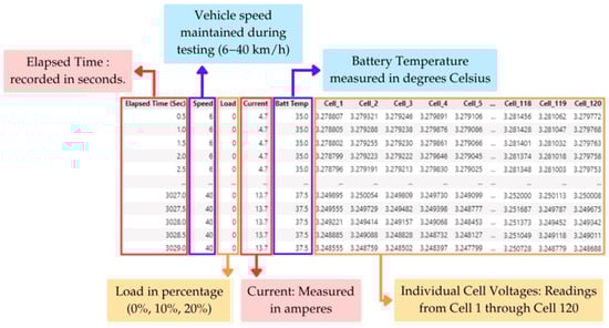 For each testing scenario, data acquisition followed a systematic protocol to ensure statistical robustness. The dataset included vehicle speed, load conditions, individual battery cell voltages (Cell 1 through Cell 120), temperature measurements, and current readings. This configuration ensured accurate tracking of battery performance and SoC variations under different operating conditions, making the collected data highly relevant for BMS optimization and machine learning applications.