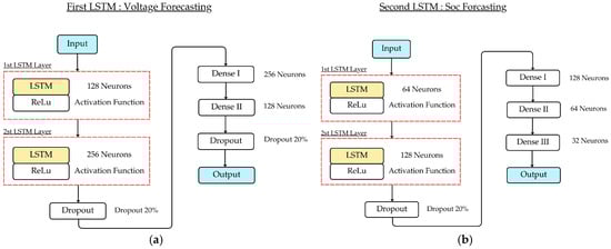 The proposed LSTM-based framework comprises two sequential models, as illustrated in Figure 2. Each utilizes distinct sets of input features tailored to their respective prediction tasks. The first LSTM model is designed for cell voltage forecasting. This includes the following: