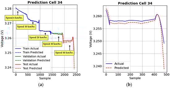 Figure 12a compares actual and predicted voltage trends for Cell 34, demonstrating a strong correlation, with the model effectively tracking variations over different speed levels. Figure 12b provides a zoomed-in perspective, highlighting areas where minor deviations occur, particularly at speed transitions. The model accurately captures voltage trends, confirming its potential for real-world battery management applications in electric vehicles.