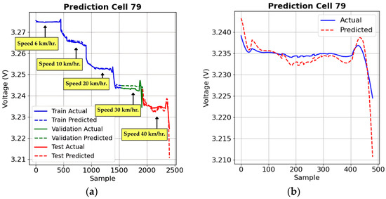 The LSTM model’s performance under Load 10% conditions demonstrates its adaptability to real-world energy demands, as illustrated in Figure 13, where voltage declines more sharply compared to Load 0% due to increased power consumption. Figure 13a shows a strong correlation between actual and predicted voltage for Cell 79, confirming the model’s ability to track fluctuations across training, validation, and testing phases.