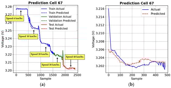 Voltage prediction performance under Load 0% conditions of example selected battery cells: (a) predicted versus actual voltage trends across training, validation, and testing phases; (b) zoomed-in test set voltage prediction.