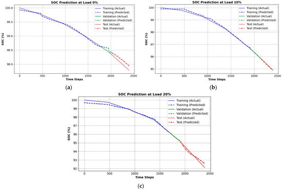 SoC prediction under different load conditions: (a) under Load 0%; (b) under Load 10%; (c) under Load 20%.