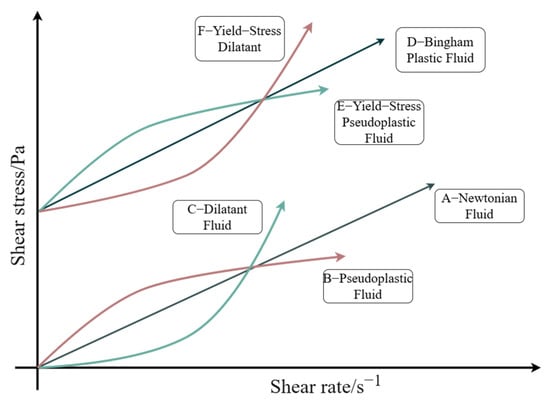 The rheological test of filling slurry is a pivotal method for studying the rheological properties of slurry and a key way to accurately obtain the rheological parameters [,,]. Slurry flow behavior in pipeline systems demonstrates significant complexity due to multiple interacting factors, particularly under field conditions. This inherent complexity, compounded by large-scale operational variability, presents substantial challenges for comprehensive control and resistance reduction. In laboratory settings, rheometers (Thermo Fisher Scientific, MA, USA) enable precise characterization of slurry rheological properties, including viscosity, yield stress, and shear rate. Excluding time-dependent effects, the slurry’s rheological behavior can be categorized into six distinct regimes, as shown in Figure 1. Each category corresponds to a distinct flow state and a specific parameter change rule.