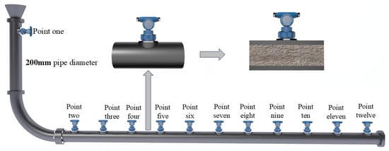 The pipeline transmission system is the main body of the whole device, and some experimental devices are shown in Table 2. The prepared slurry is pumped to the storage tank of the upper operating platform using a mud pump. When the upper storage tank reaches the predetermined liquid level height, the valve below is opened to allow the slurry to fall freely into the vertical pipe section. A sensor point is set at the entrance of the vertical pipe section, serving as the entrance of the experimental pipeline, named the “No. 1” sensor point. At this moment, the pumping cannot stop. The upper storage tank is equipped with an overflow pipe, ensuring that the liquid level of the upper storage tank remains unchanged, thereby maintaining constant upper hydraulic pressure. The slurry flows through the elbow into the straight pipe section, where a sensor point is positioned every 50 cm, totaling 11 collection and monitoring points, as shown in Figure 3. Beginning from the elbow to the outlet of the straight pipe, they are named sensor points “2” to “12”. The slurry flows out from the outlet of the straight pipe section to the storage tank below to complete a cycle.