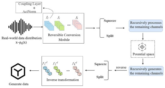 The reasoning of the flow-based model is predicated on the variable substitution formula. Let the invertible transformation be denoted by , where is the set of parameters of the -step transformation. According to the established mathematical framework, the invertible transformation, , possesses the property that there exists a unique inverse transformation, , satisfying the following condition: