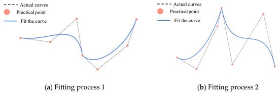 The B-spline function is a widely utilized tool in interpolation and fitting, employed to delineate a smooth function curve through a set of control points, as illustrated in Figure 7 for the cubic spline difference. The B-spline basis function is distinguished by local support, implying that each basis function is non-zero only in a finite interval. This ensures that the basis function is localized and does not extend beyond the boundaries of the curve. Secondly, the B-spline basis function is non-negative, meaning that the value of each basis function is always non-negative. This property ensures the reasonableness of the calculation results. Finally, the B-spline basis function has additivity, i.e., the sum of all the basic functions is always 1. This property enables the B-spline to maintain smoothness during the interpolation process and avoids the occurrence of the overfitting phenomenon. The B-spline basis function, , depends on the distribution of the nodes as well as the order, p, of the spline function, and the zero-order spline basis function is